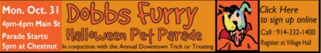 This year Dobbs Ferry is sponsoring a Pet Parade in conjunction with their annual Halloween Trick or Treat Parade on Main Street. The pet portion of the parade starts at the corner of Chestnut Street and Main Street at 5 PM. The Trick or Treat Parade starts at 4 PM. You can find an application for your pet here: http://downtowndobbs.wufoo.com/forms/2011-dobbs-furry-halloween-pet-parade-registration/