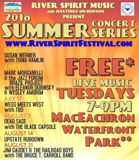 On September 8 there will be the Grand Finale – The River Spirit Music & Arts Festival, a full-day event at Draper Park, also in Hastings-on-Hudson. The September 8 event requires tickets, which range in price from $10 – $15 for children to $35 for adults. Children under 5, free.